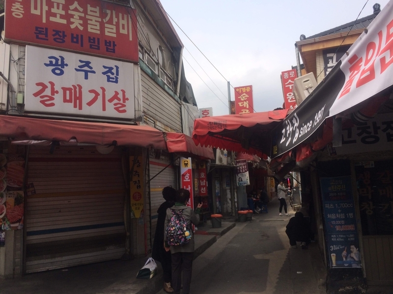 路地を見つけたので入ってみる。ハングルの看板が立ち並んでいて、英語の案内などもほぼない。こういうところもいいよね。