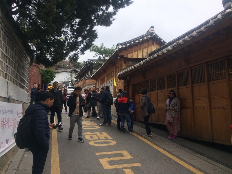 北村韓屋村に到着。この観光スポット、どうやら住宅街らしい。入口にあたる場所にはお店もあったが、奥へ進むと住宅地って感じがする。観光客はたくさんいる。