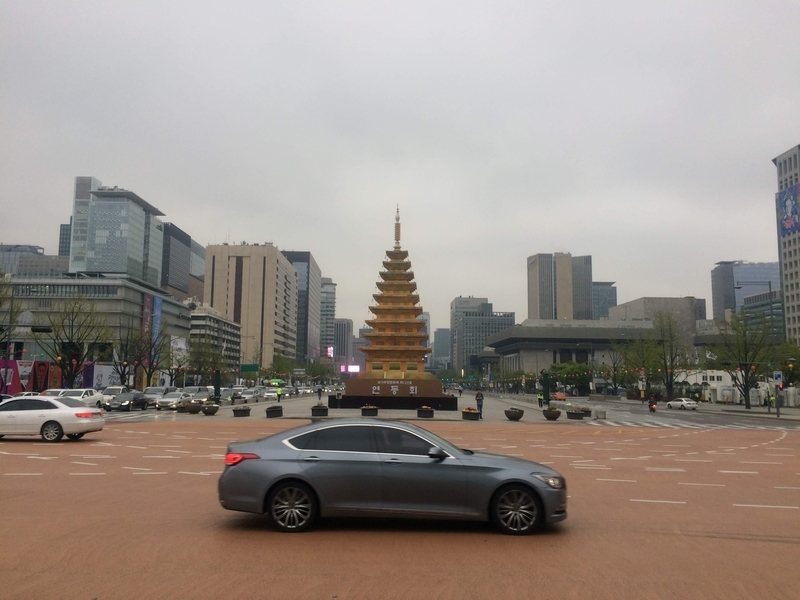 景福宮正面の向かい側の景色。ソウルのまちのすぐ北側に歴史的建造物がある感じだ。街と密接な距離にそういう場所があるのは、歴史ある街なのだということを感じさせる。