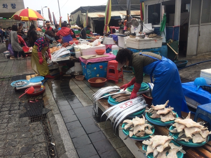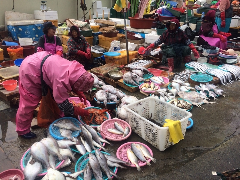 海の町ならではの光景だ。服装や物が色とりどりだ。そういえば、韓国のおばちゃんってこういう色のウインドブレーカーを着てるイメージがある。