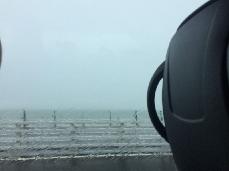 バスはただ海の上をひた走る。天気よかったらいい景色なんだろうなー。見渡すかぎり海の景色を、バスがひた走る。途中では地下?に潜ったりもした。すごい橋だ。