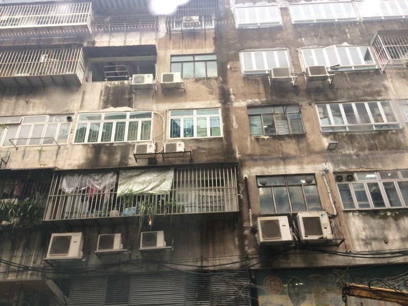 どの建物もベランダがなく、窓の周囲に増設してベランダっぽい部分をつくっていた。生活感がはみだしてる感じが、独特の雰囲気をつくりだしていた。