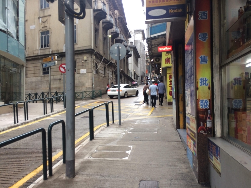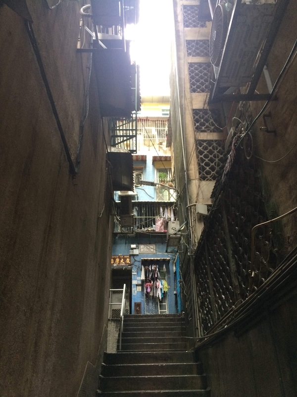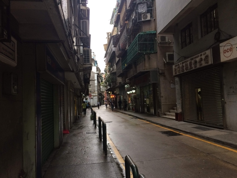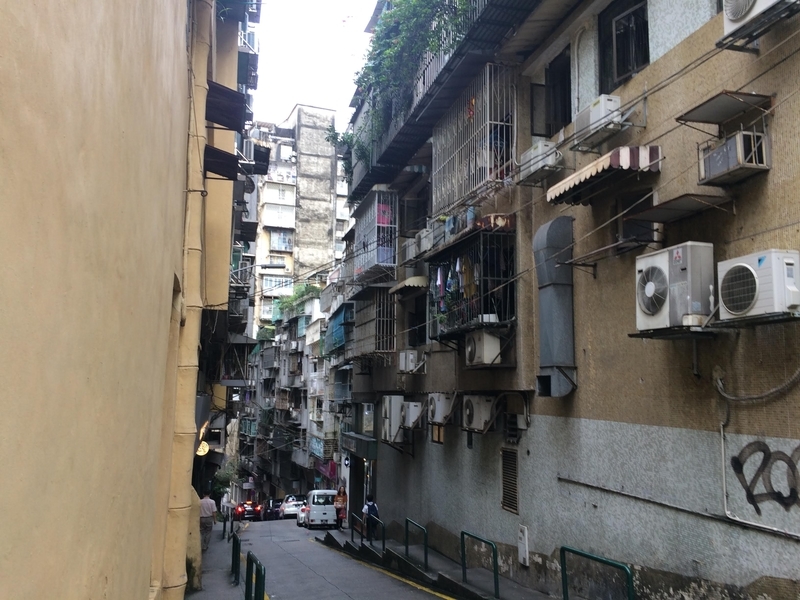ほそーい路地を発見。ここも室外機がせり出してる。地震あったら降ってきそうだな。地震がないからできる建物構造だ。