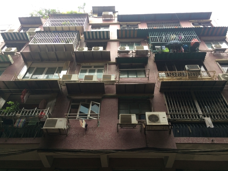 ベランダがあとづけでつけられている。室外機もすごい。どうやって設置してるんだ?