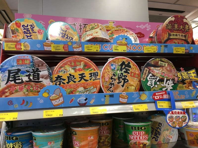コンビニで日本のカップラーメンを見つけた。その下に並んでる、日本では見かけない味のカップラーメン買いたかったな〜。買いそびれた。
