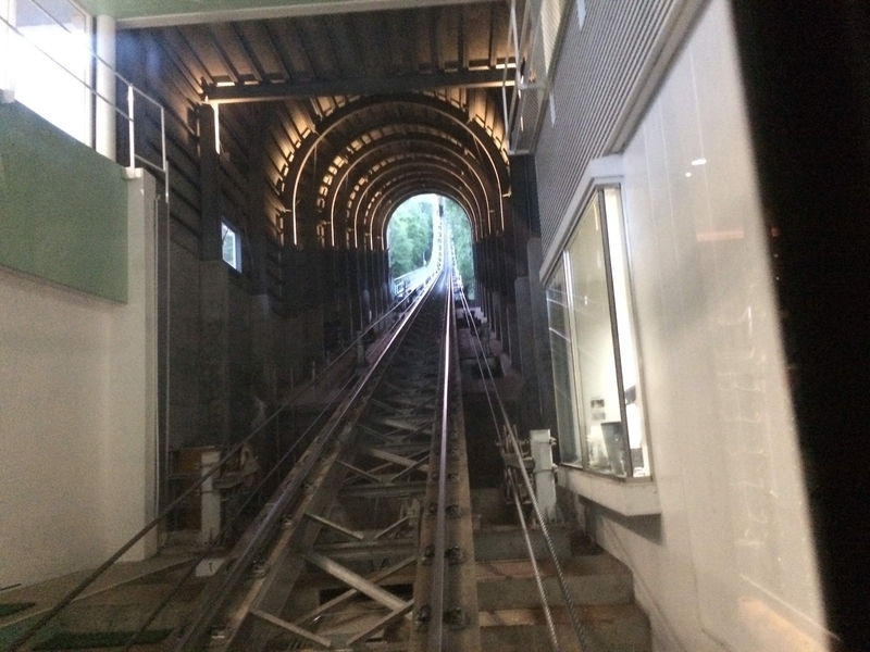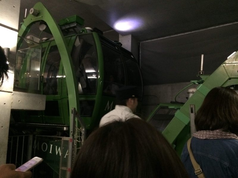 急勾配を行く乗り物。かなりの急勾配だ。こちらは大きめの観覧車みたいな乗り物で座席もあった。やはり立ち乗り含めいっぱいだったけど。