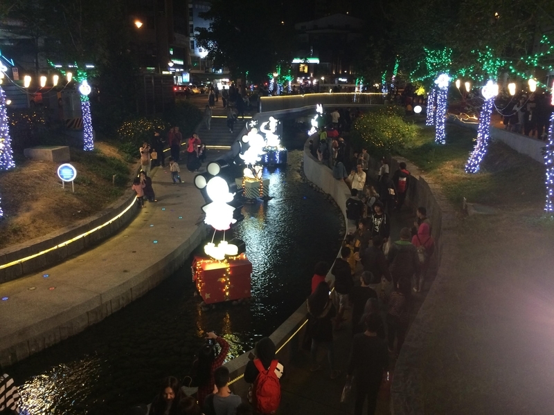 途中の川にはイルミネーション。ミッキーのオブジェが置かれてる。なかなかの人の賑わいだ。こういう水辺がまちなかにあるのいいよね。