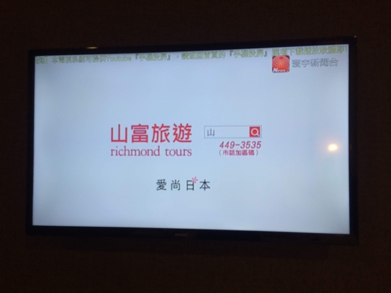 CMも中国語。これは日本の旅行ツアーのCMだった。まちなかでも日本の旅行ツアーの広告を何度か見かけた。たしか大阪とか神戸だったかな。