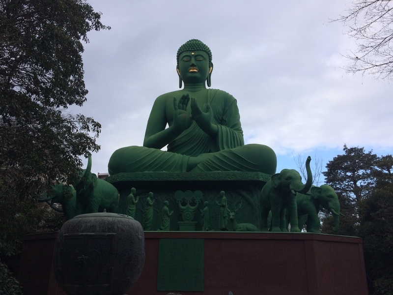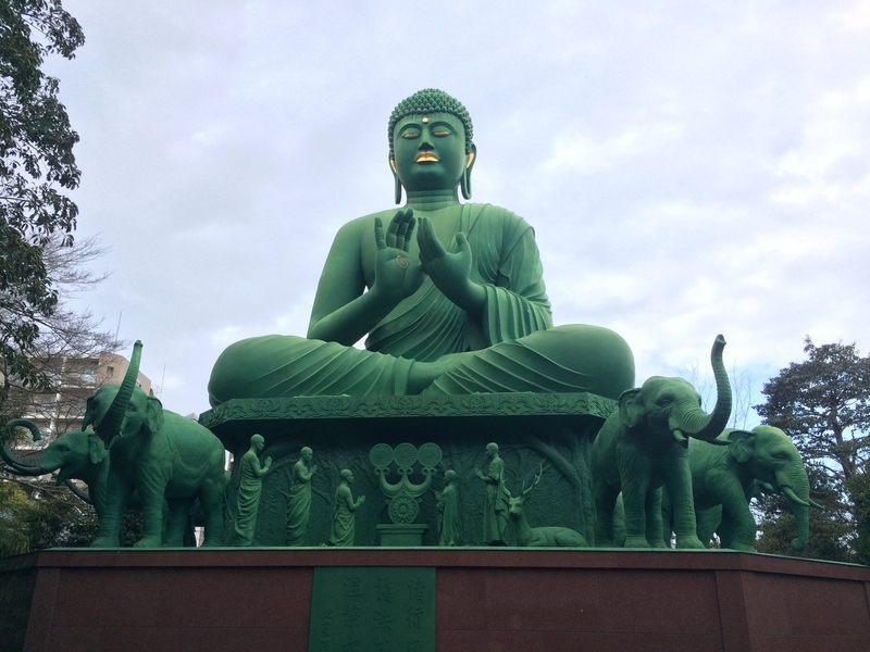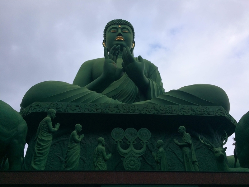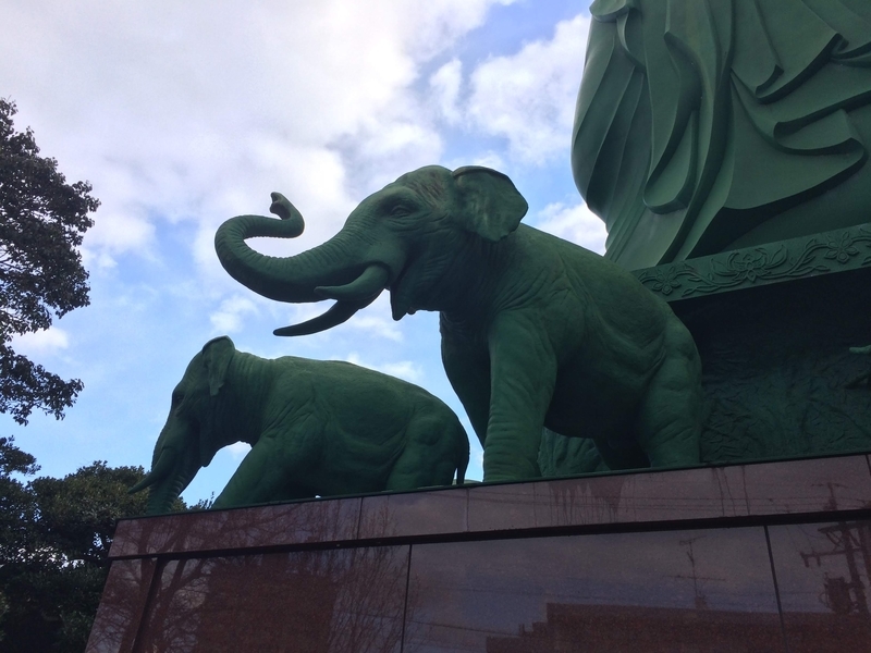 配色や象など、どことなく異国感をまとっている大仏である。とはいえ大仏それ自体の造形はわりと普通でしっかりしているため、海外でみた大仏でよく見かけるゆるさは意外にもあまりない。