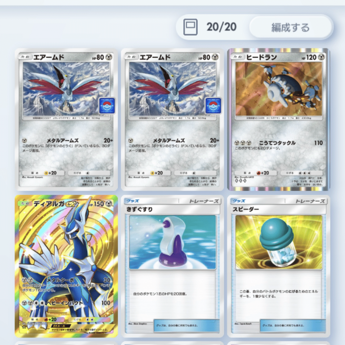 ディアルガがようやく1枚引けたので、低コスト高火力のエアームド2枚とディアルガのエネ加速を利用して早めの高ダメージを狙う2枚。
