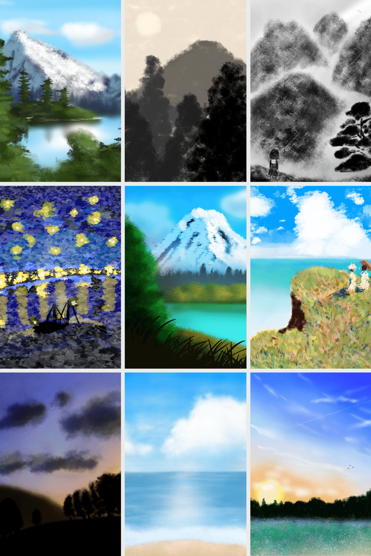 ボブロス画法からはじめて、水墨画風、印象派風、ゴッホ風などに挑戦している。