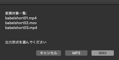 display dialog "変換対象一覧:" & return & displayText & return & return & "出力形式を選んでください" buttons {"キャンセル", "MP3", "WAV"} default button "WAV"